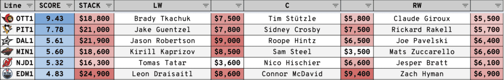 | Guentzel – Crosby – Rakell Zucker – Malkin – Rust McGinn – Carter – Kapanen Poehling – Blueger – Archibald Pettersson – Letang Dumoulin – Rutta Joseph – Ruhwedel | Robertson – Hintz – Pavelski Marchment – Seguin – Dellandrea Benn – Johnston – Gurianov Kiviranta – Faksa – Glendening Heiskanen – Lundkvist Suter – Miller Lindell – Hakanpää |