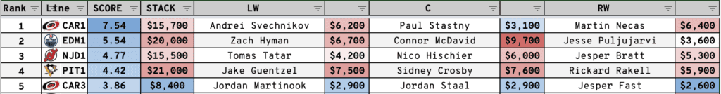| Guentzel – Crosby – Rakell Zucker – Malkin – Rust McGinn – Carter – Heinen O’Connor – Blueger – Kapanen Pettersson – Letang Dumoulin – Rutta Joseph – Friedman | Tatar – Hischier – Bratt Haula – Hughes – Mercer Sharangovich – Boqvist – Holtz Wood – McLeod – Zetterlund Siegenthaler – Hamilton Bahl – Severson Okhotyuk – Smith |