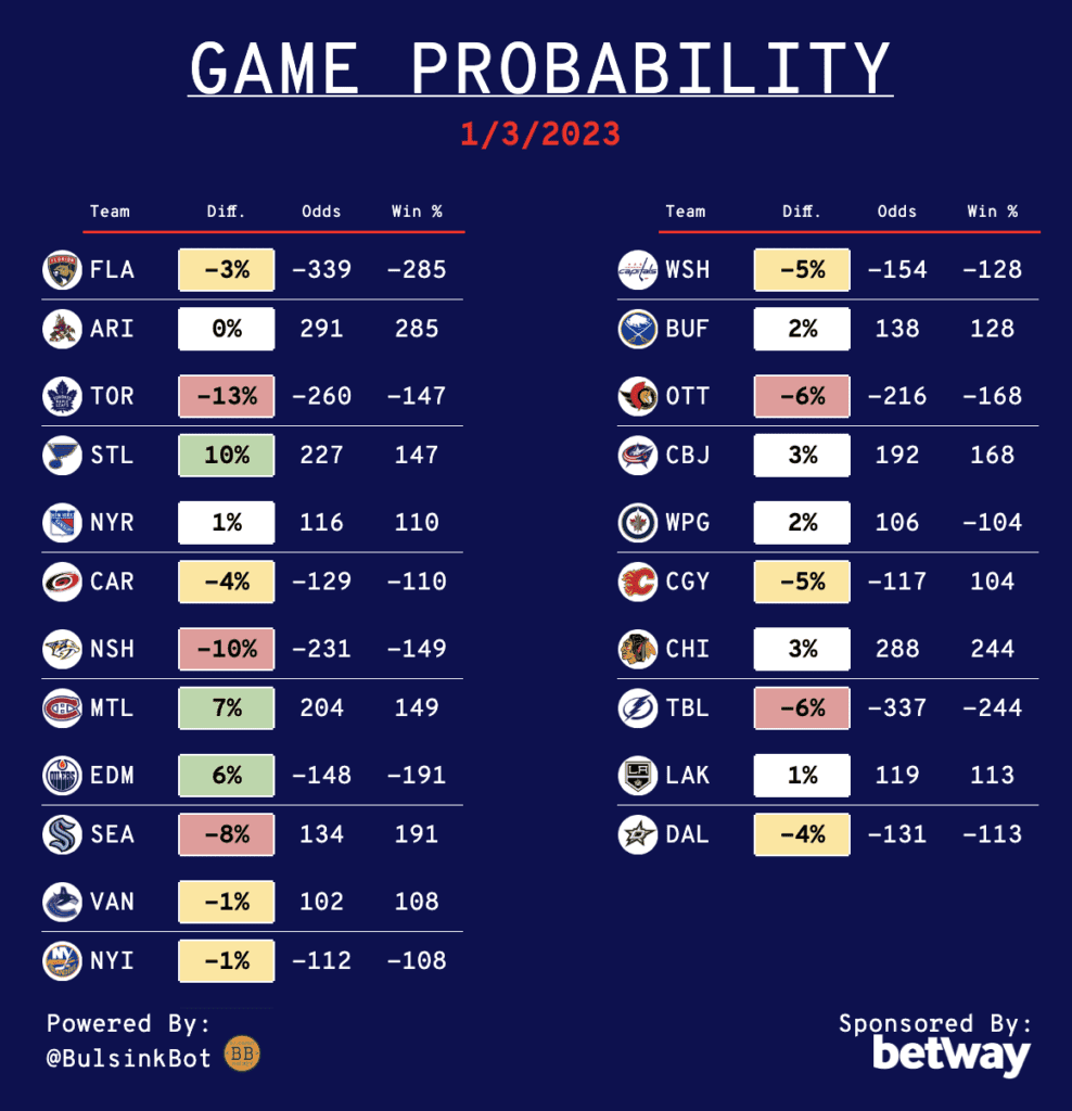 The model also likes the Blues tonight but it hasn’t had a chance to react to them missing both Ryan O’Reilly and Vladimir Tarasenko tonight. Both players were played on IR on Monday.