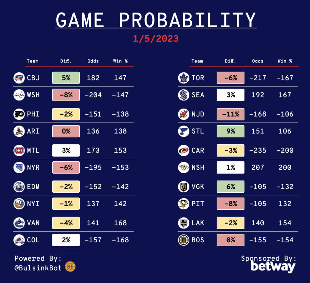 Each day we will look at each game, the Sportsbook Odds (via Betway), and the odds of each team winning based on the model created by Philip Bulsink. Based on those two numbers, we can quickly identify which teams we need to bet on, which teams to avoid and which lines to keep an eye on throughout the day.