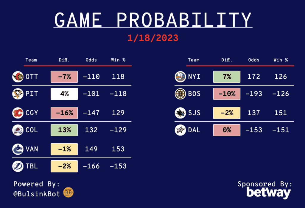 Each day we will look at each game, the Sportsbook Odds (via Betway), and the odds of each team winning based on the model created by Philip Bulsink. Based on those two numbers, we can quickly identify which teams we need to bet on, which teams to avoid and which lines to keep an eye on throughout the day.