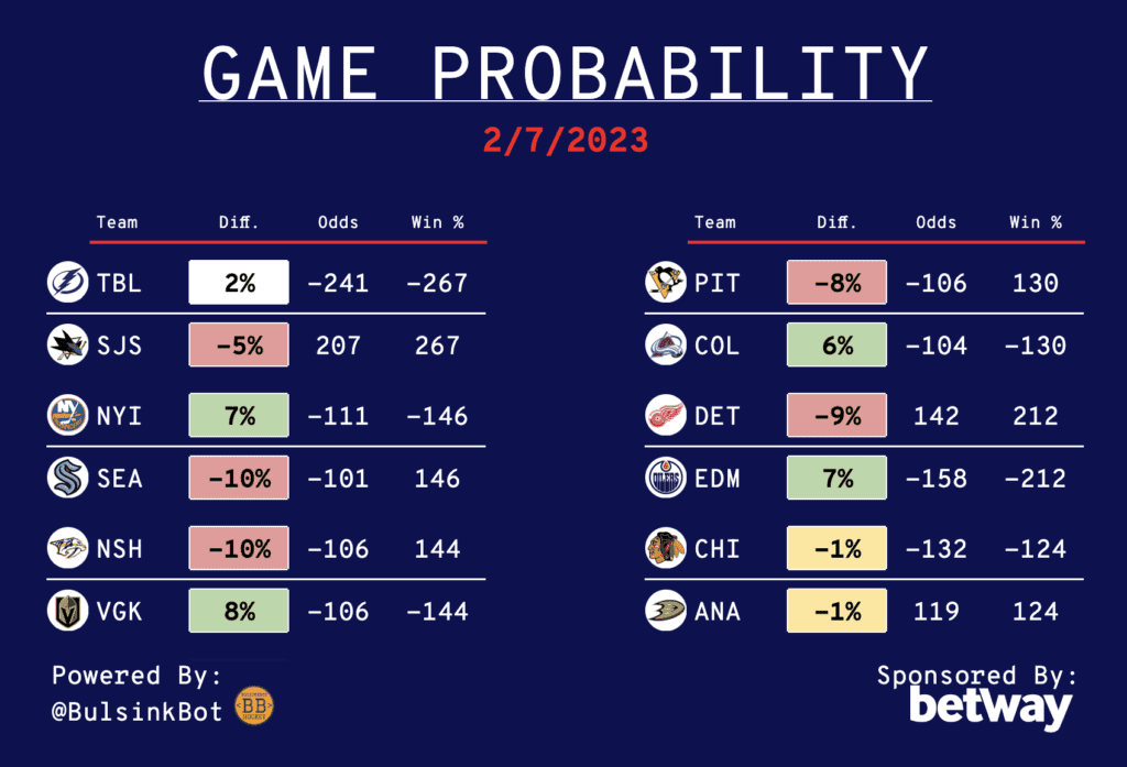 The Oilers were playing extremely well heading into the All-Star break, winning seven of their last eight while averaging 5.0 goals for and 2.4 goals against per game. Over their last 25 games, they lead the NHL in xGF/60 and are fourth in xGF% (54.56%). In the same timeframe, Detroit is 26th in xGF% (47.77%). It seems like the Oilers should be larger favourites than -158, and the model agrees (-212).