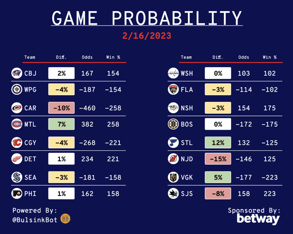 Each day we will look at each game, the Sportsbook Odds (via Betway), and the odds of each team winning based on the model created by Philip Bulsink. Based on those two numbers, we can quickly identify which teams we need to bet on, which teams to avoid and which lines to keep an eye on throughout the day.