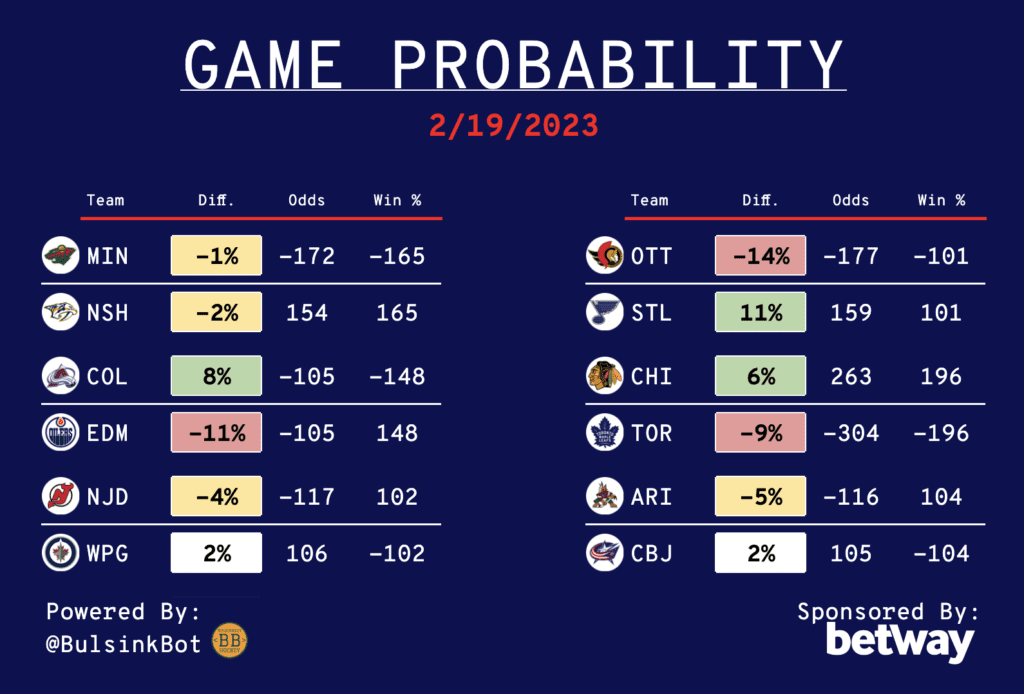 Each day we will look at each game, the Sportsbook Odds (via Betway), and the odds of each team winning based on the model created by Philip Bulsink. Based on those two numbers, we can quickly identify which teams we need to bet on, which teams to avoid and which lines to keep an eye on throughout the day.