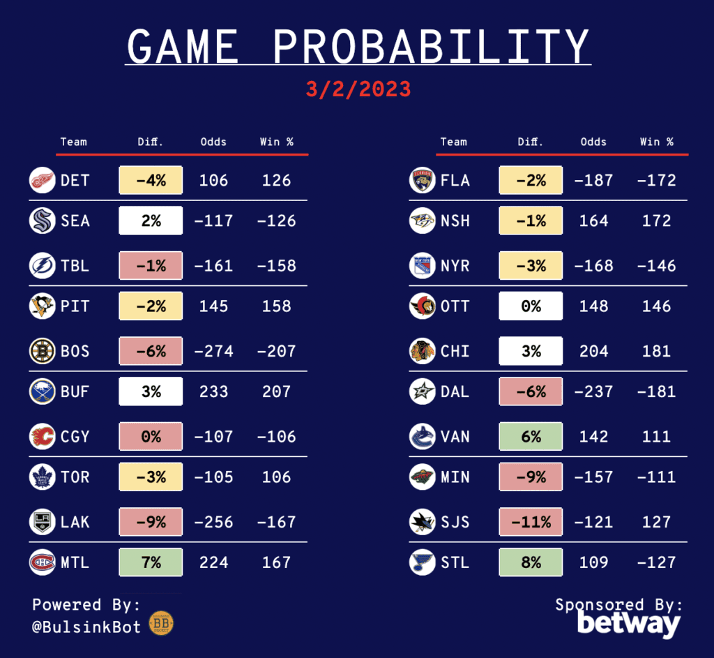 Each day we will look at each game, the Sportsbook Odds (via Betway), and the odds of each team winning based on the model created by Philip Bulsink. Based on those two numbers, we can quickly identify which teams we need to bet on, which teams to avoid and which lines to keep an eye on throughout the day.