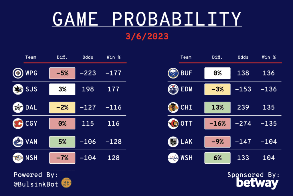 Each day we will look at each game, the Sportsbook Odds (via Betway), and the odds of each team winning based on the model created by Philip Bulsink. Based on those two numbers, we can quickly identify which teams we need to bet on, which teams to avoid and which lines to keep an eye on throughout the day.