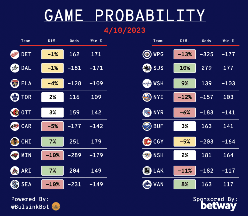 Each day we will look at each game, the Sportsbook Odds (via Betway), and the odds of each team winning based on the model created by Philip Bulsink. Based on those two numbers, we can quickly identify which teams we need to bet on, which teams to avoid and which lines to keep an eye on throughout the day.