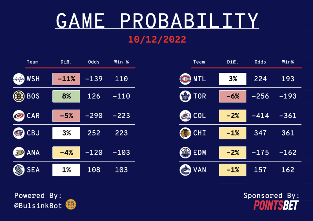Each day we will look at each game, the Sportsbook Odds (via PointsBet), and the odds of each team winning based on the model created by Philip Bulsink. Based on those two numbers, we can quickly identify which teams we need to bet on, which teams to avoid and which lines to keep an eye on throughout the day.