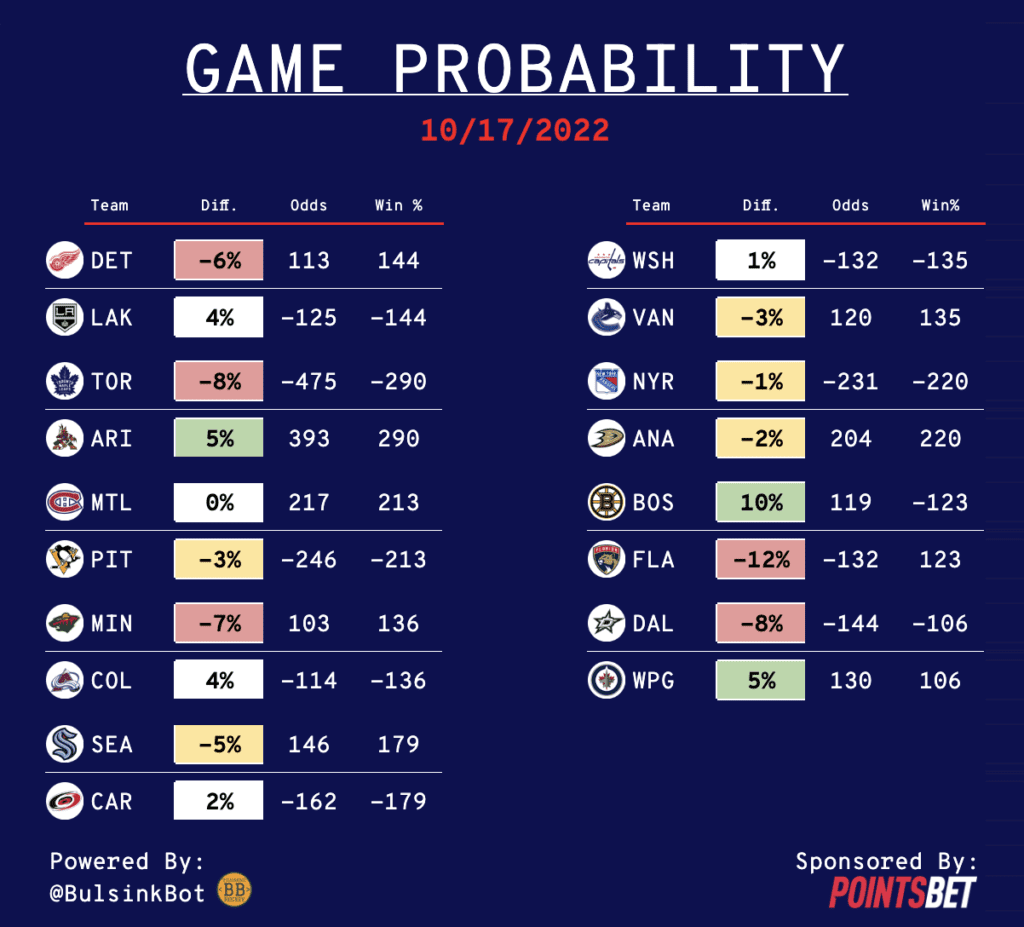 Each day we will look at each game, the Sportsbook Odds (via PointsBet), and the odds of each team winning based on the model created by Philip Bulsink. Based on those two numbers, we can quickly identify which teams we need to bet on, which teams to avoid and which lines to keep an eye on throughout the day.
