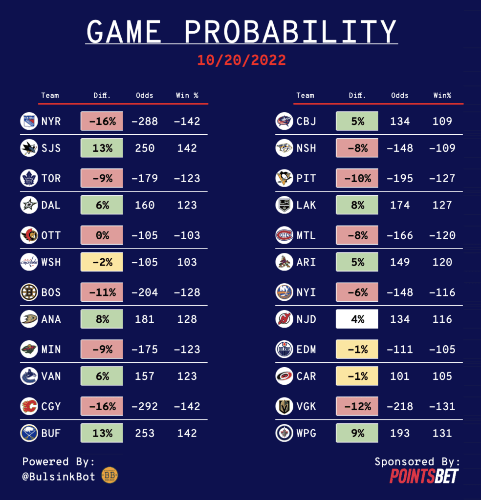 Each day we will look at each game, the Sportsbook Odds (via PointsBet), and the odds of each team winning based on the model created by Philip Bulsink. Based on those two numbers, we can quickly identify which teams we need to bet on, which teams to avoid and which lines to keep an eye on throughout the day.