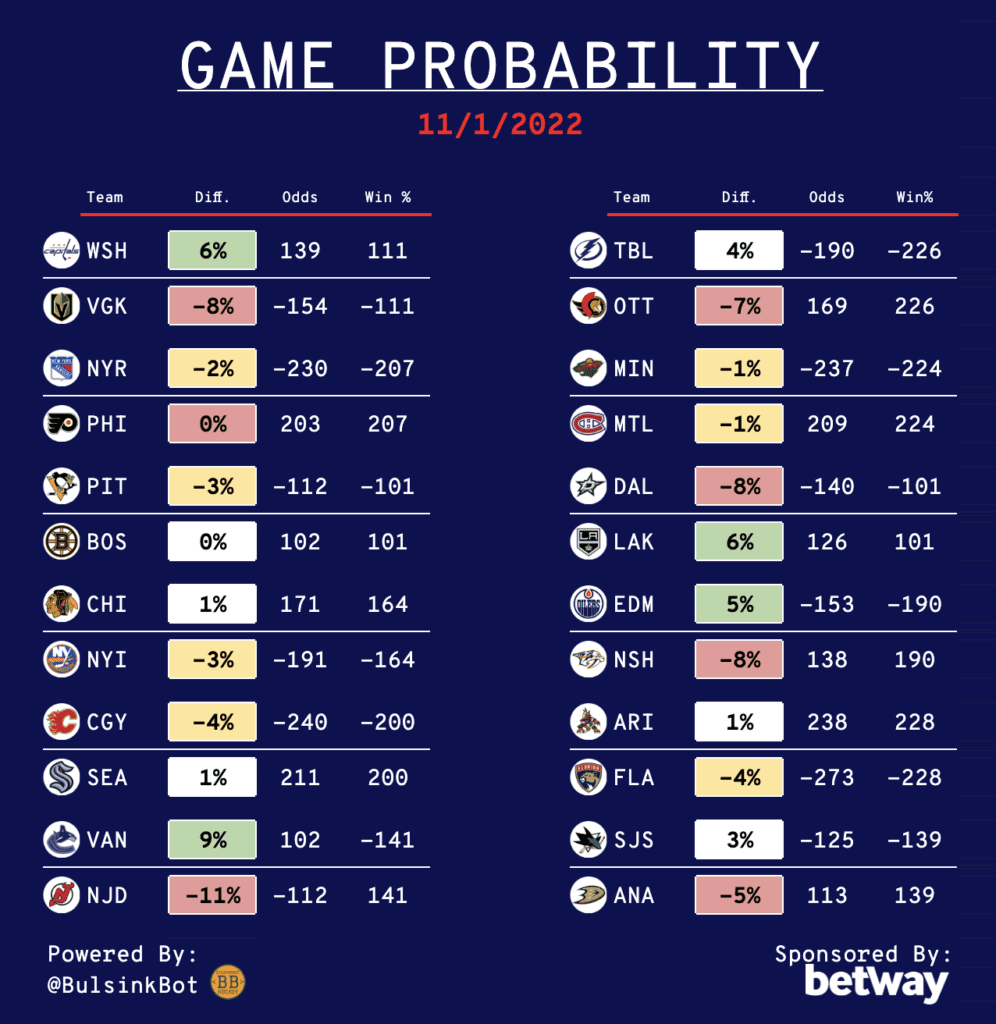 Each day we will look at each game, the Sportsbook Odds (via Betway), and the odds of each team winning based on the model created by Philip Bulsink. Based on those two numbers, we can quickly identify which teams we need to bet on, which teams to avoid and which lines to keep an eye on throughout the day.
