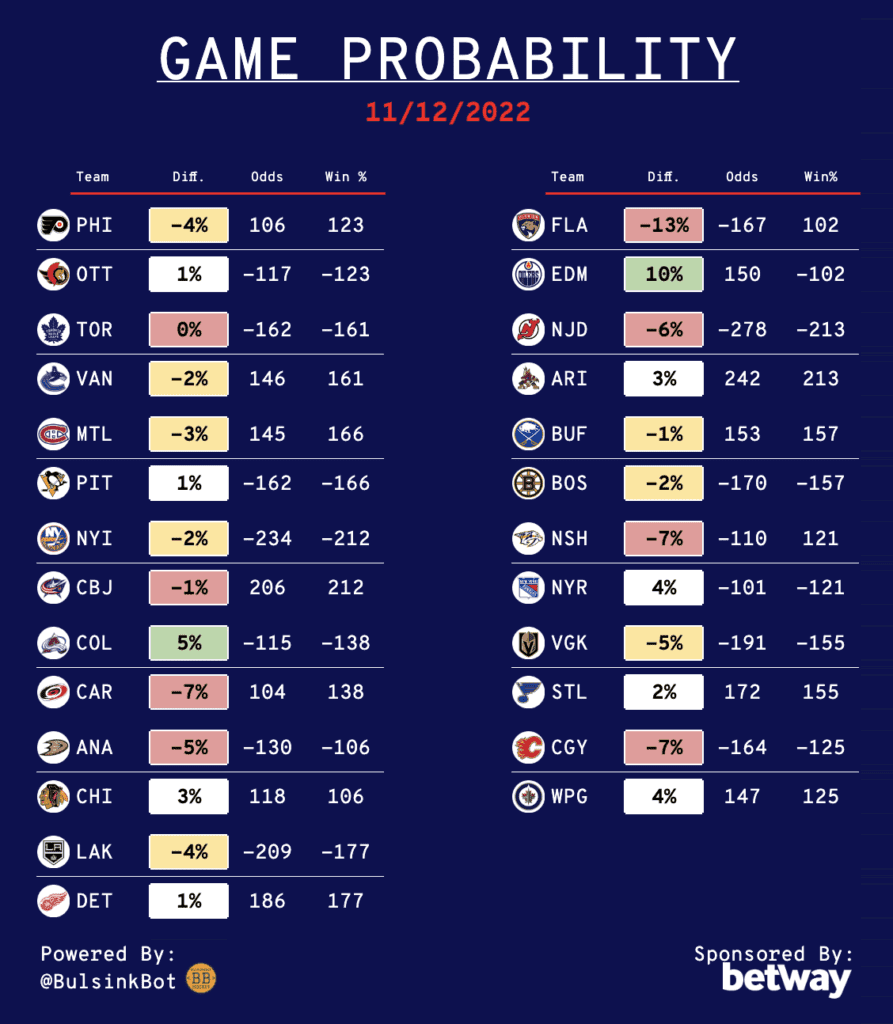 Each day we will look at each game, the Sportsbook Odds (via Betway), and the odds of each team winning based on the model created by Philip Bulsink. Based on those two numbers, we can quickly identify which teams we need to bet on, which teams to avoid and which lines to keep an eye on throughout the day.