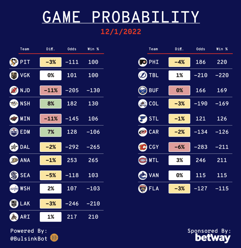 Each day we will look at each game, the Sportsbook Odds (via Betway), and the odds of each team winning based on the model created by Philip Bulsink. Based on those two numbers, we can quickly identify which teams we need to bet on, which teams to avoid and which lines to keep an eye on throughout the day.