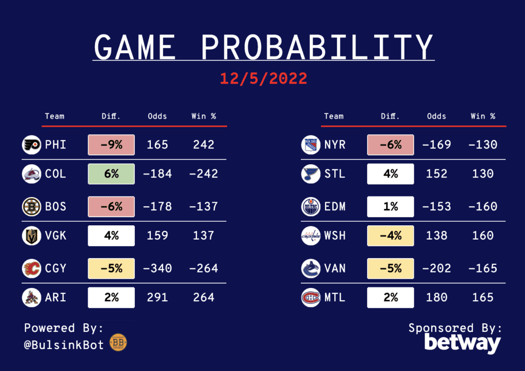 Aside from an ugly 5-1 loss in Boston on Saturday, the Avalanche have done a nice job managing their injuries. Since the start of November, they’ve gone 9-4-0 while averaging 3.5 goals for and 2.6 goals against. They should be able to handle the Flyers tonight. They are -184 road favourites but model likes them up to -192.