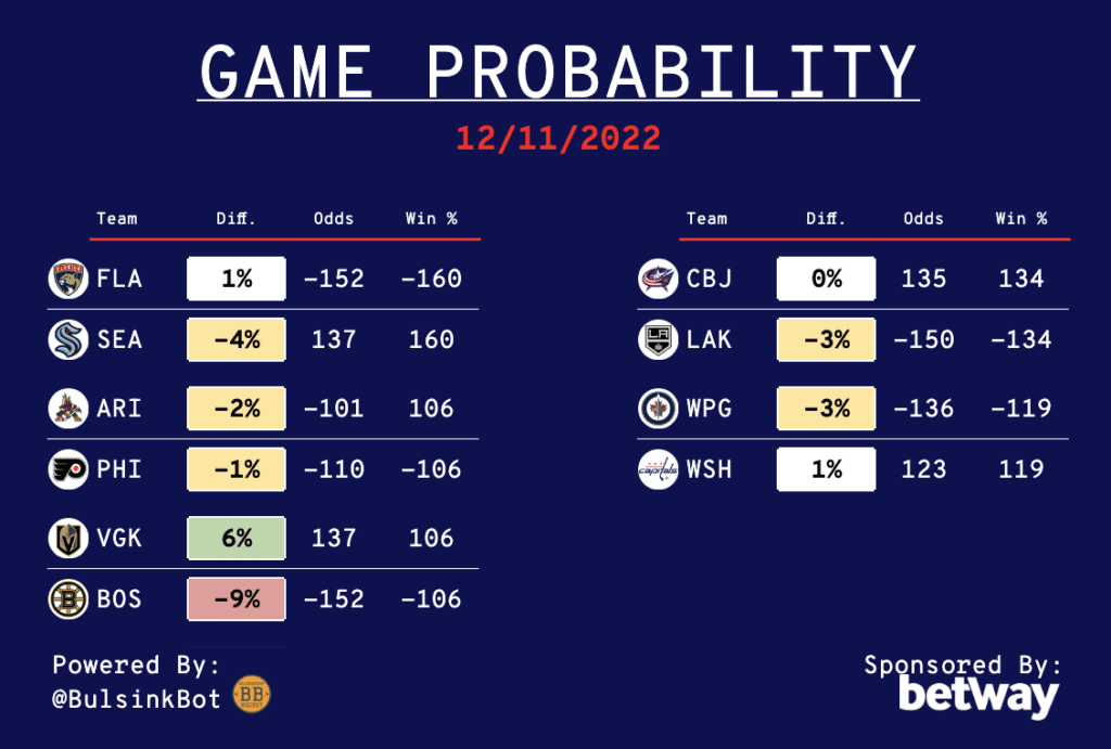 Each day we will look at each game, the Sportsbook Odds (via Betway), and the odds of each team winning based on the model created by Philip Bulsink. Based on those two numbers, we can quickly identify which teams we need to bet on, which teams to avoid and which lines to keep an eye on throughout the day.