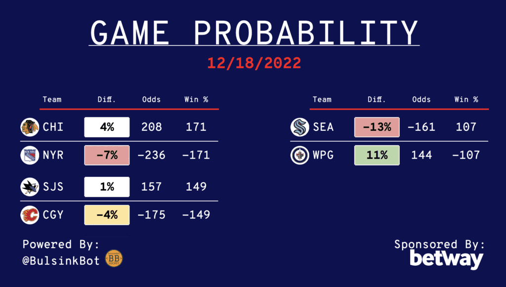 Typically I would avoid model picks when the team is on a back-to-back, but when there’s this much value, I will make an exception. The Jets are +144 road underdogs but the model likes them at -107. Even if you downgrade them a bit because of the back-to-back and David Rittich starting, there’s still like 20 cents worth of value on them at +144.