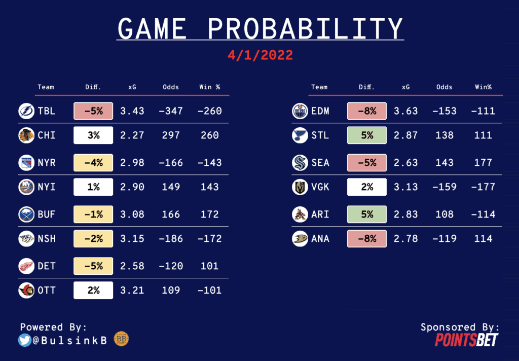 Each day we will look at each game, the Sportsbook Odds (via PointsBet), and the odds of each team winning based on the model created by Philip Bulsink. Based on those two numbers, we can quickly identify which teams we need to bet on, which teams to avoid and which lines to keep an eye on throughout the day.