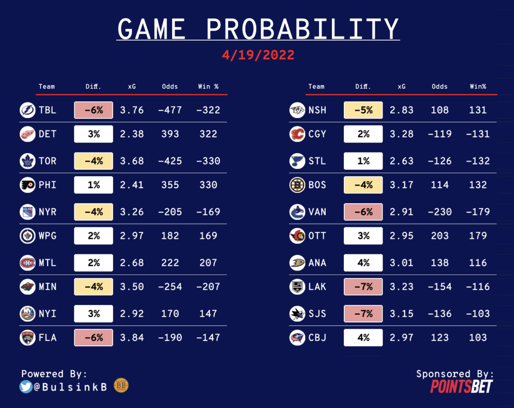 Each day we will look at each game, the Sportsbook Odds (via PointsBet), and the odds of each team winning based on the model created by Philip Bulsink. Based on those two numbers, we can quickly identify which teams we need to bet on, which teams to avoid and which lines to keep an eye on throughout the day.