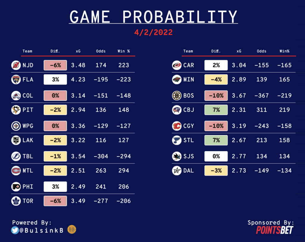 Each day we will look at each game, the Sportsbook Odds (via PointsBet), and the odds of each team winning based on the model created by Philip Bulsink. Based on those two numbers, we can quickly identify which teams we need to bet on, which teams to avoid and which lines to keep an eye on throughout the day.