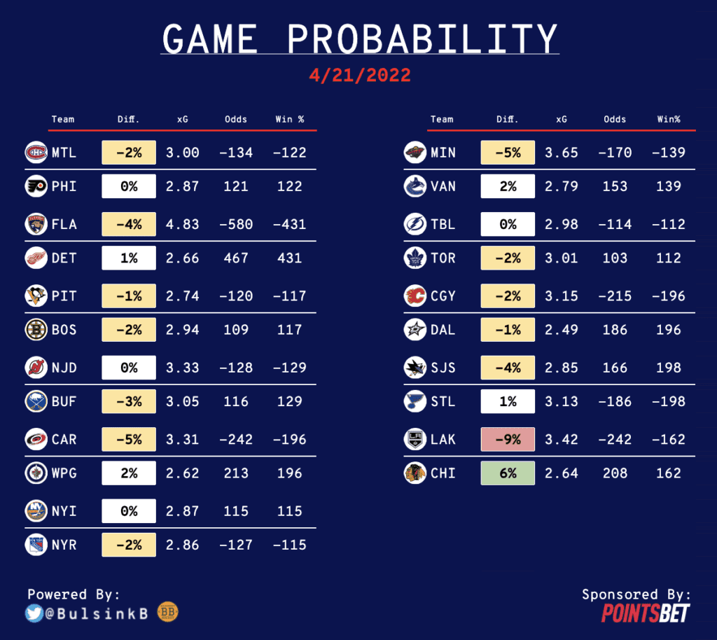 Each day we will look at each game, the Sportsbook Odds (via PointsBet), and the odds of each team winning based on the model created by Philip Bulsink. Based on those two numbers, we can quickly identify which teams we need to bet on, which teams to avoid and which lines to keep an eye on throughout the day.