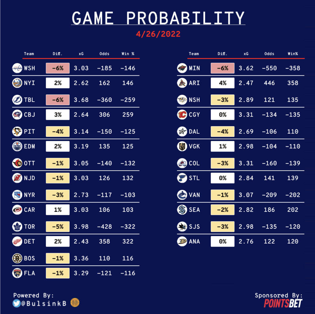 Each day we will look at each game, the Sportsbook Odds (via PointsBet), and the odds of each team winning based on the model created by Philip Bulsink. Based on those two numbers, we can quickly identify which teams we need to bet on, which teams to avoid and which lines to keep an eye on throughout the day.