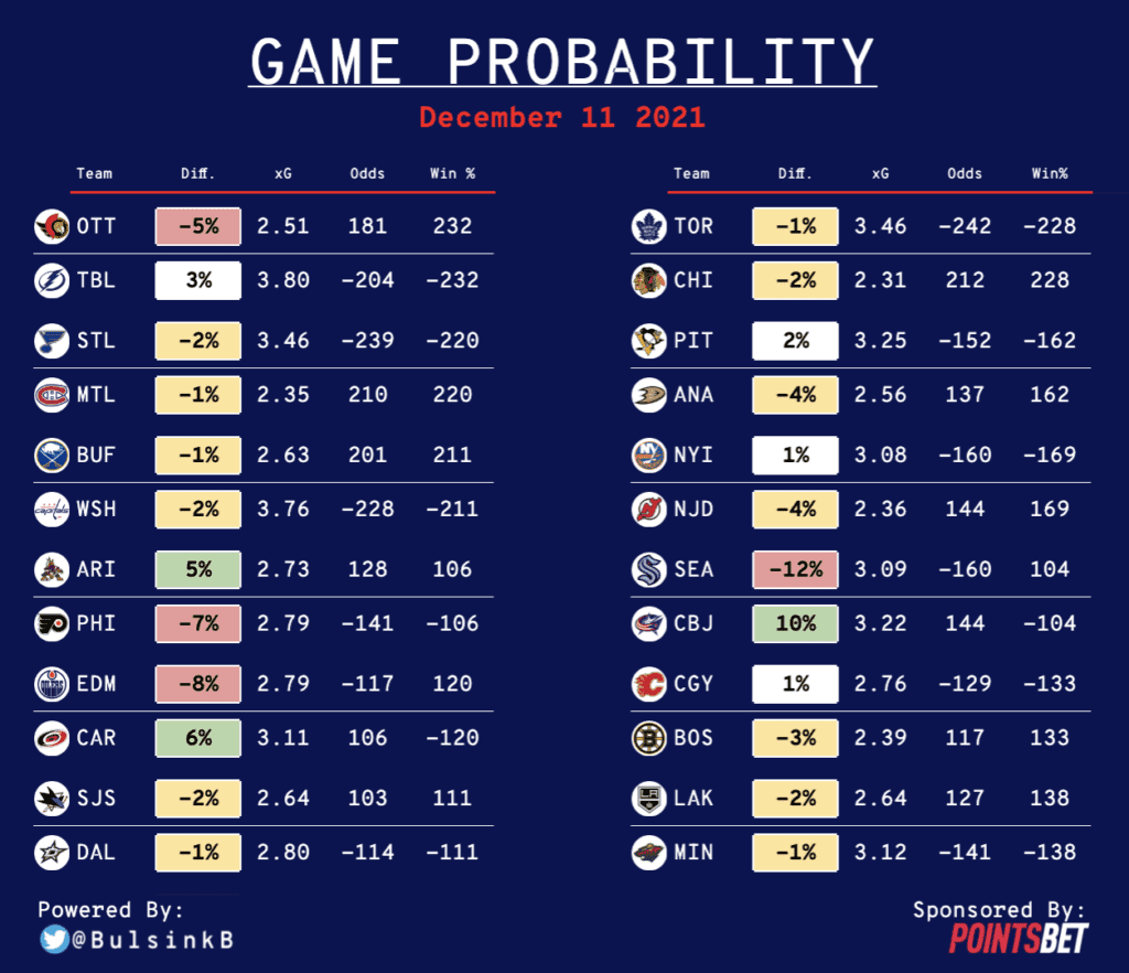 With two inept offences going head-to-head, it’s easy to lean towards the team with the better goaltending. Elvis Merzlikins has been among the best in the league, while Philipp Grubauer is dead last in Goals Saved Above Expected (-17.3).