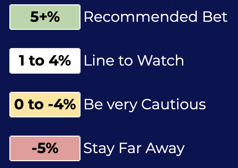The number to keep an eye on is the “Diff.” which is the percentage difference between the model’s projected Win% and the projected Win% based on PointsBet odds. To find out how odds turn into percentages, use our Odds Calculator.