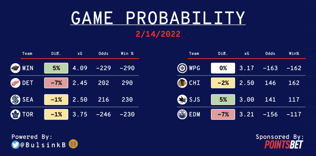 The Sharks return to action on Monday, playing their first game since January 1st. They will be well-rested but hopefully not rusty. They are sizeable home underdogs (+141) vs. the Oilers but the model sees it as a much closer matchup. Edmonton is coming off of an impressive win over the Islanders on home ice but are 3-3-3 while giving up an average of 3.4 goals per game in their last nine road games.