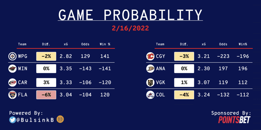 Each day we will look at each game, the Sportsbook Odds (via PointsBet), and the odds of each team winning based on the model created by Philip Bulsink. Based on those two numbers, we can quickly identify which teams we need to bet on, which teams to avoid and which lines to keep an eye on throughout the day.