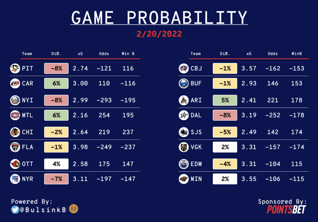 Each day we will look at each game, the Sportsbook Odds (via PointsBet), and the odds of each team winning based on the model created by Philip Bulsink. Based on those two numbers, we can quickly identify which teams we need to bet on, which teams to avoid and which lines to keep an eye on throughout the day.