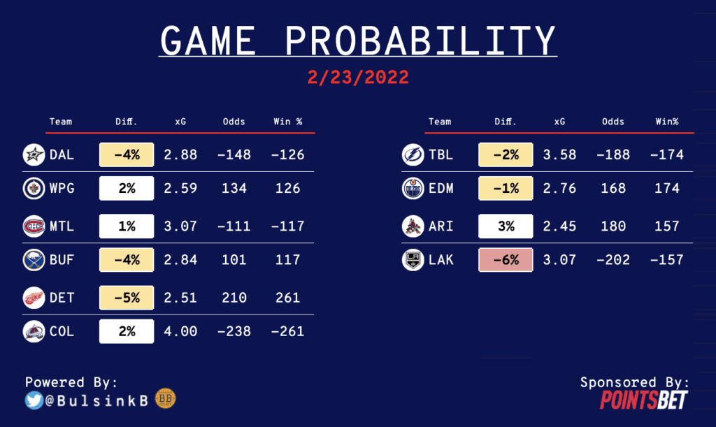 Each day we will look at each game, the Sportsbook Odds (via PointsBet), and the odds of each team winning based on the model created by Philip Bulsink. Based on those two numbers, we can quickly identify which teams we need to bet on, which teams to avoid and which lines to keep an eye on throughout the day.