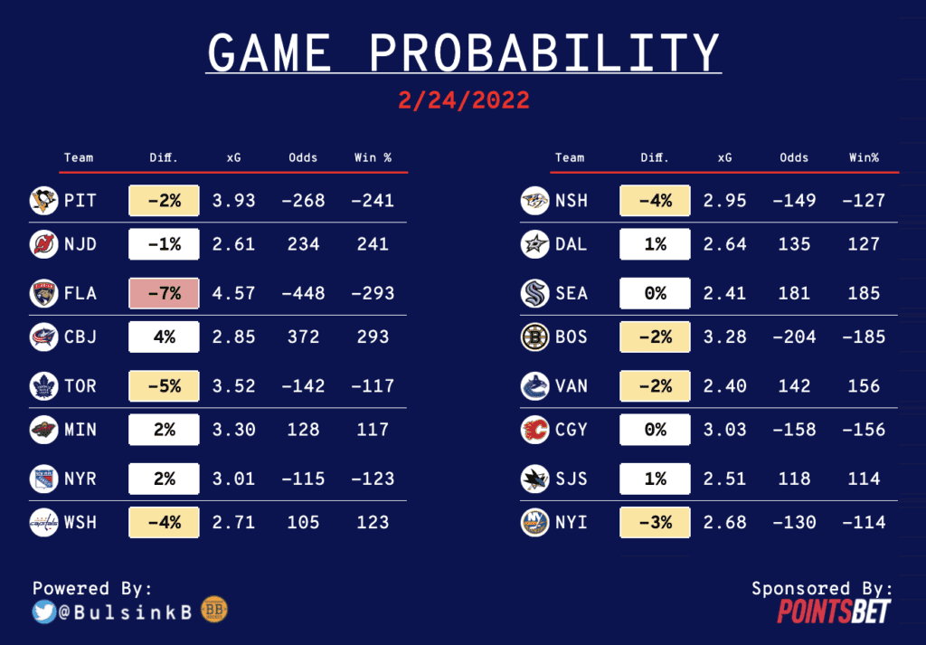 Each day we will look at each game, the Sportsbook Odds (via PointsBet), and the odds of each team winning based on the model created by Philip Bulsink. Based on those two numbers, we can quickly identify which teams we need to bet on, which teams to avoid and which lines to keep an eye on throughout the day.