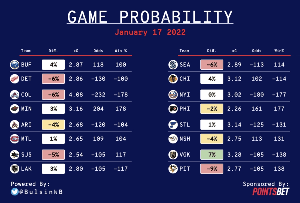 Each day we will look at each game, the Sportsbook Odds (via PointsBet), and the odds of each team winning based on the model created by Philip Bulsink. Based on those two numbers, we can quickly identify which teams we need to bet on, which teams to avoid and which lines to keep an eye on throughout the day.