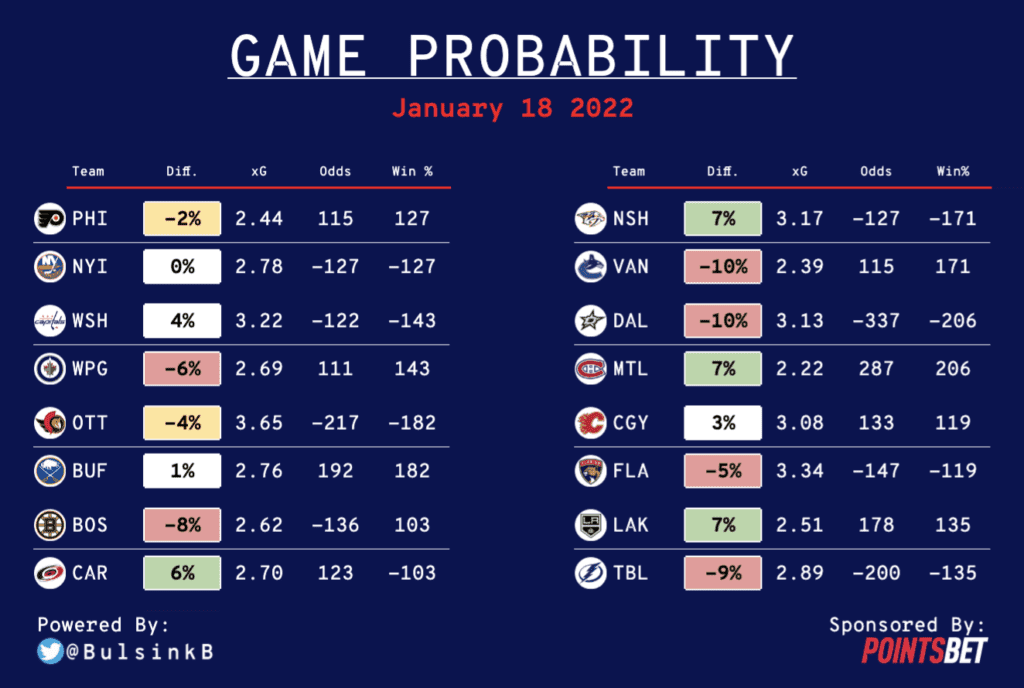 Each day we will look at each game, the Sportsbook Odds (via PointsBet), and the odds of each team winning based on the model created by Philip Bulsink. Based on those two numbers, we can quickly identify which teams we need to bet on, which teams to avoid and which lines to keep an eye on throughout the day.