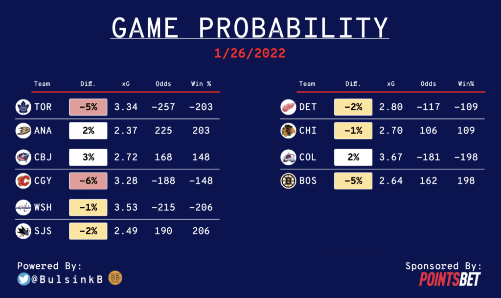 Each day we will look at each game, the Sportsbook Odds (via PointsBet), and the odds of each team winning based on the model created by Philip Bulsink. Based on those two numbers, we can quickly identify which teams we need to bet on, which teams to avoid and which lines to keep an eye on throughout the day.