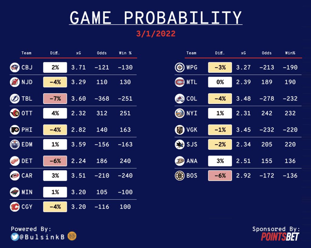 Each day we will look at each game, the Sportsbook Odds (via PointsBet), and the odds of each team winning based on the model created by Philip Bulsink. Based on those two numbers, we can quickly identify which teams we need to bet on, which teams to avoid and which lines to keep an eye on throughout the day.