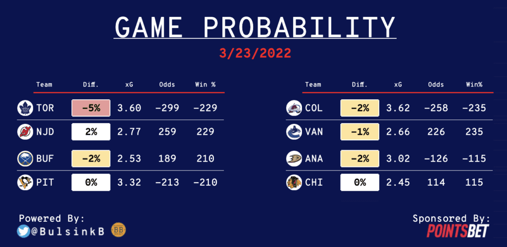 Each day we will look at each game, the Sportsbook Odds (via PointsBet), and the odds of each team winning based on the model created by Philip Bulsink. Based on those two numbers, we can quickly identify which teams we need to bet on, which teams to avoid and which lines to keep an eye on throughout the day.