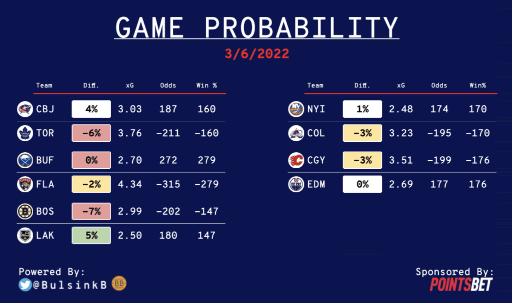 Each day we will look at each game, the Sportsbook Odds (via PointsBet), and the odds of each team winning based on the model created by Philip Bulsink. Based on those two numbers, we can quickly identify which teams we need to bet on, which teams to avoid and which lines to keep an eye on throughout the day.