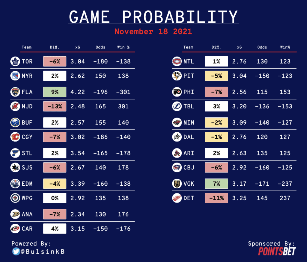 Each day we will look at each game, the Sportsbook Odds (via PointsBet), and the odds of each team winning based on the model created by Philip Bulsink. Based on those two numbers, we can quickly identify which teams we need to bet on, which teams to avoid and which lines to keep an eye on throughout the day.