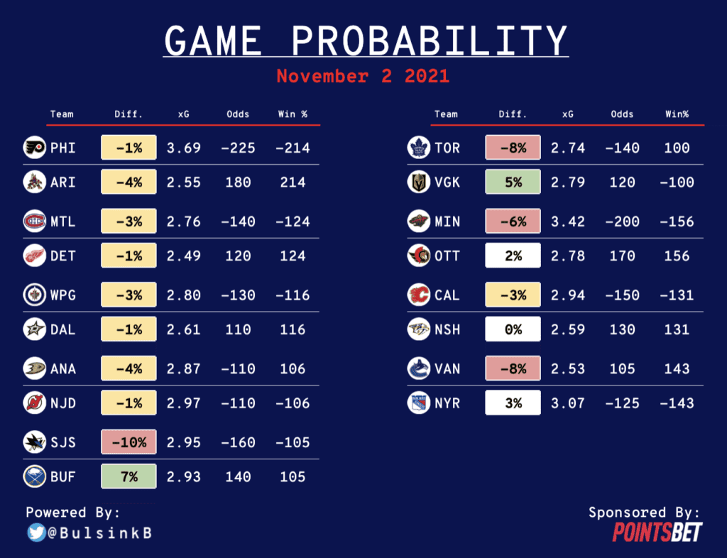 Each day we will look at each game, the Sportsbook Odds (via PointsBet), and the odds of each team winning based on the model created by Philip Bulsink. Based on those two numbers, we can quickly identify which teams we need to bet on, which teams to avoid and which lines to keep an eye on throughout the day.