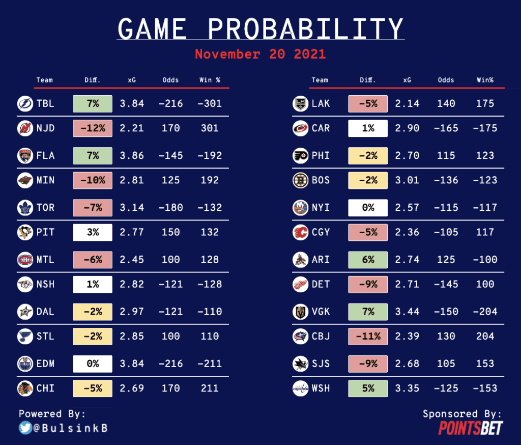 Each day we will look at each game, the Sportsbook Odds (via PointsBet), and the odds of each team winning based on the model created by Philip Bulsink. Based on those two numbers, we can quickly identify which teams we need to bet on, which teams to avoid and which lines to keep an eye on throughout the day.