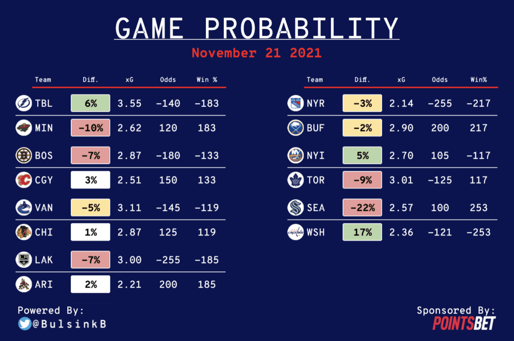 Each day we will look at each game, the Sportsbook Odds (via PointsBet), and the odds of each team winning based on the model created by Philip Bulsink. Based on those two numbers, we can quickly identify which teams we need to bet on, which teams to avoid and which lines to keep an eye on throughout the day.