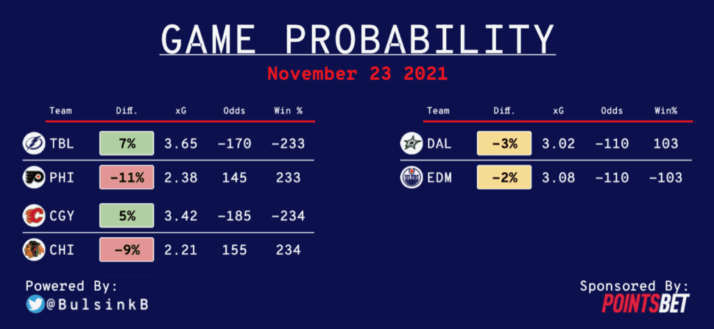 The Flames have turned into a defensive juggernaut this season. They have posted shutouts in seven of their first 19 games. While their league-high .958 5v5 SV% isn’t sustainable, they rank ninth in xGA (2.15) and seventh in xGF% (52.73), so goals against Calgary will remain difficult to come by. Tonight, the Blackhawks come into town averaging the fewest xGF/60 (1.76). They’re 5-1-0 since the coaching change, but they’ve scored just 2.33 goals per game. On the surface, it looks like they’ve improved defensively, allowing just 11 goals in six games (1.83), but the underlying numbers suggest not much has changed. They’ve gone from 2.50 xGA/60 under Jeremy Colliton to 2.33 xGA/60 under Derek King. The difference has been the goaltending, going from a .873 5v5 SV% (32nd) to a .968 5v5 SV% (2nd). One team is actually good and the other team is a bad team pretending to be good. The model agrees, seeing Calgary as the biggest favorite on the slate (-234) and sees value in them at -185.