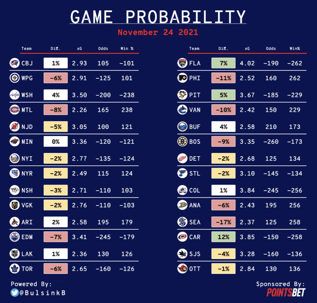 Carolina is coming off a rare loss in San Jose, and Seattle finally got a good goaltending performance out of Philipp Grubauer. The sportsbooks continue to be believers in the Kraken, but the model views this as the second biggest mismatch on the slate (-258), so take advantage of the -150 line.