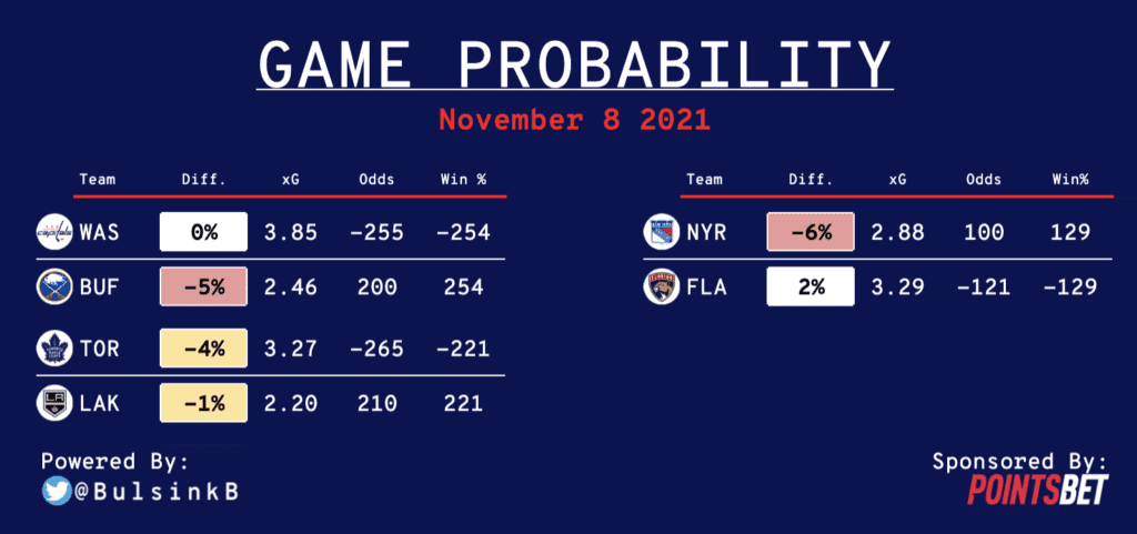 Each day we will look at each game, the Sportsbook Odds (via PointsBet), and the odds of each team winning based on the model created by Philip Bulsink. Based on those two numbers, we can quickly identify which teams we need to bet on, which teams to avoid and which lines to keep an eye on throughout the day.