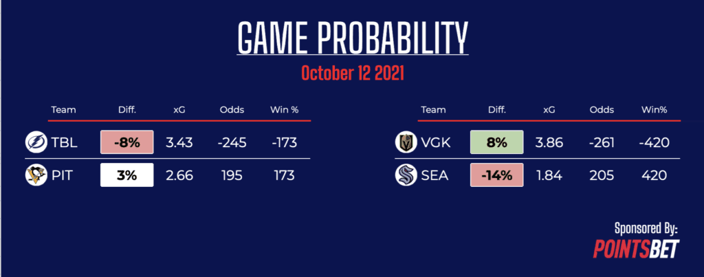 – The Golden Knights open their season at home against the newly minted Seattle Kraken. It looks like the market believes that Seattle could enjoy the same level of success that Vegas enjoyed early in their inaugural season. However, the model does not believe that they have the same talent level. Vegas looks massively undervalued in the books right now, especially with the Kraken potentially shorthanded. Calle Jarnkrok, Marcus Johansson, Jared McCann, Joonas Donskoi and Jamie Oleksiak are all in COVID-19 protocol as of Monday, which would leave them without four of their top-9 forwards and a top-4 defenseman. Vegas looks like the only good target on Day 1 of the new season.