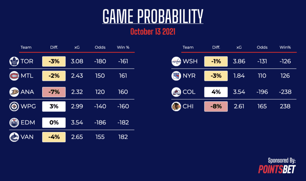 After the Avalanche, the only other line you should really be tracking today is the Jets. Currently, at -150, there’s not quite enough value there to recommend a bet, but if it starts to inch towards -130 then we’ll be in business. With Mark Scheifele suspended for the opener, it will be interesting if money starts to come in on the Ducks.
