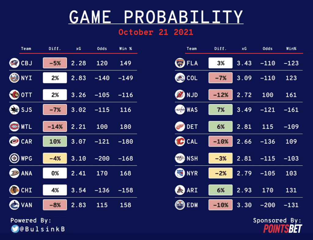 While technically the model sees value on betting the Coyotes at +170 tonight, the 2021-22 data sample on Arizona is likely too small for it to realize just how bad this team is. They’ve been crushed by the Blue Jackets and Blues and now they get Connor McDavid and Leon Draisaitl. With Mikko Koskinen or Stuart Skinner starting for Edmonton, it gives Arizona a glimmer of hope, but betting this team is only for the most courageous.