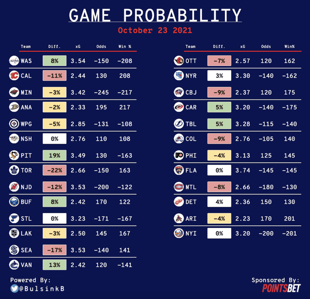 I have been all about the Sabres’ hot start but it’s tough to like them in a back-to-back scenario. They hung in tough with the Bruins last night and still grade out as one of the best defensive teams in hockey but the back-to-back makes me hesitant about the model’s optimism.