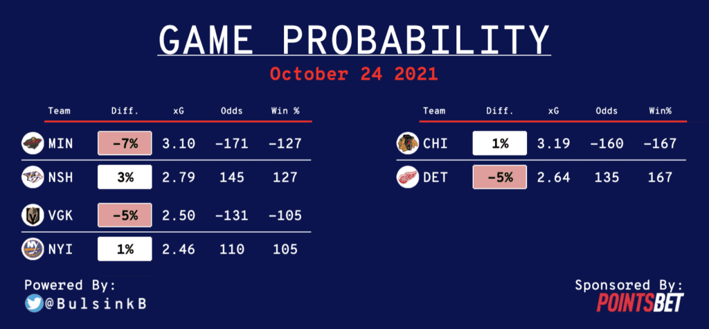 The model isn’t suggesting a lot of action on this small Sunday slate. The model seems to be pretty closely linked up with PointsBet odds. The only game it would consider looking at is the Nashville Predators (@ MIN). However, there’s a good chance that Connor Ingram will be making his NHL debut, which makes the bet much riskier. I would suggest staying away from it and waiting for tomorrow’s seven-game slate!